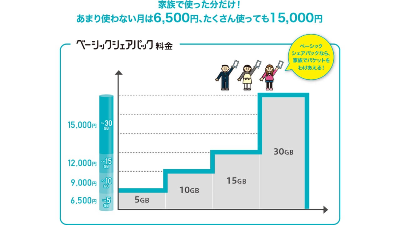 例えば個人向けの「ベーシックパック」は「データ M パック(5GB)」が月額 5,000 円なので、毎月 5GB までで収まっている場合は「ベーシックパック」の方がお得となる可能性があります。家族向け「ベーシックシェアパック」は、毎月 30GB を超えない場合は「ベーシックシェアパック」に移行したほうがお得となる可能性があります。