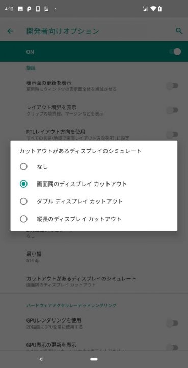 また公式には発表されていませんが、“開発者向けオプション” に新たなディスプレイシミュレート機能の “カットアウトがあるディスプレイのシミュレート” も追加されていました。“カットアウトがあるディスプレイのシミュレート” は、いわゆるノッチディスプレイのシミュレーション機能です。ただしこれまでと異なり、上部右サイドや上下のノッチシミュレートができるようになっています。