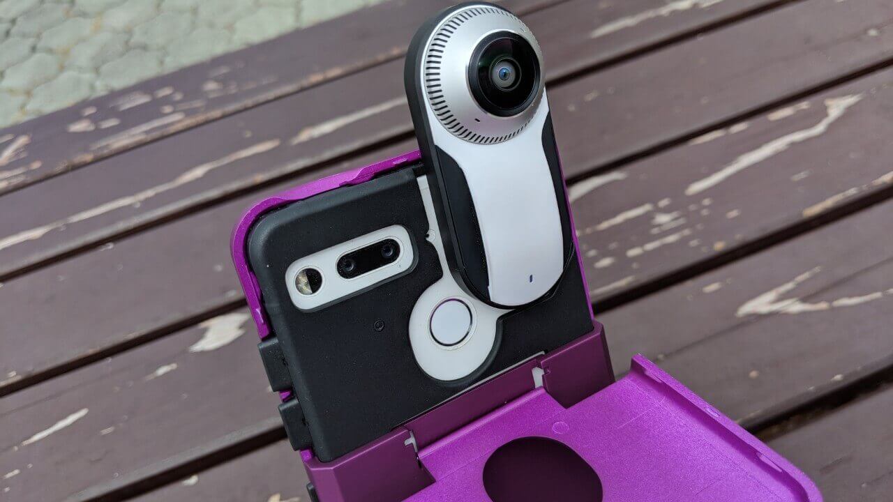 「DUEDUE ハイブリッドケース」の特徴は、TPU 製のインナーケースとポリカーボネート製のアウターケースの 2 重構造となっている点で、「360 Camera」を使用する際はアウターケースの背面上部をパカッと開ける仕様となります。