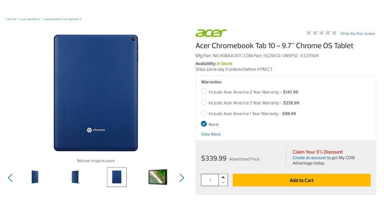Acer が 2018 年 3 月に教育機関向けとして発表した、初のタブレット型 Chromebook「Chromebook Tab 10」が、米国のビジネス向けオンラインストア CDW で発売されました。