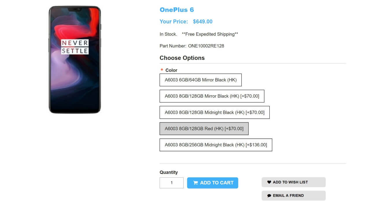 「OnePlus 6」“レッド” は、8GB RAM + 128GB 内部ストレージの 1 モデルのみです。1ShopMobile における価格は、国際送料込み $649.00(約 71,850 円)。
