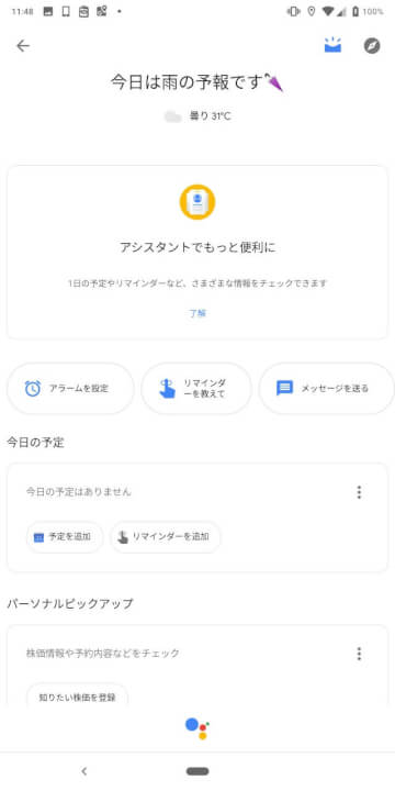 「Google アシスタント」のパーソナル情報ページは、「Google」アプリのフィード画面に表示されるボタンを押すことで表示されるページと同じ仕様のページです。