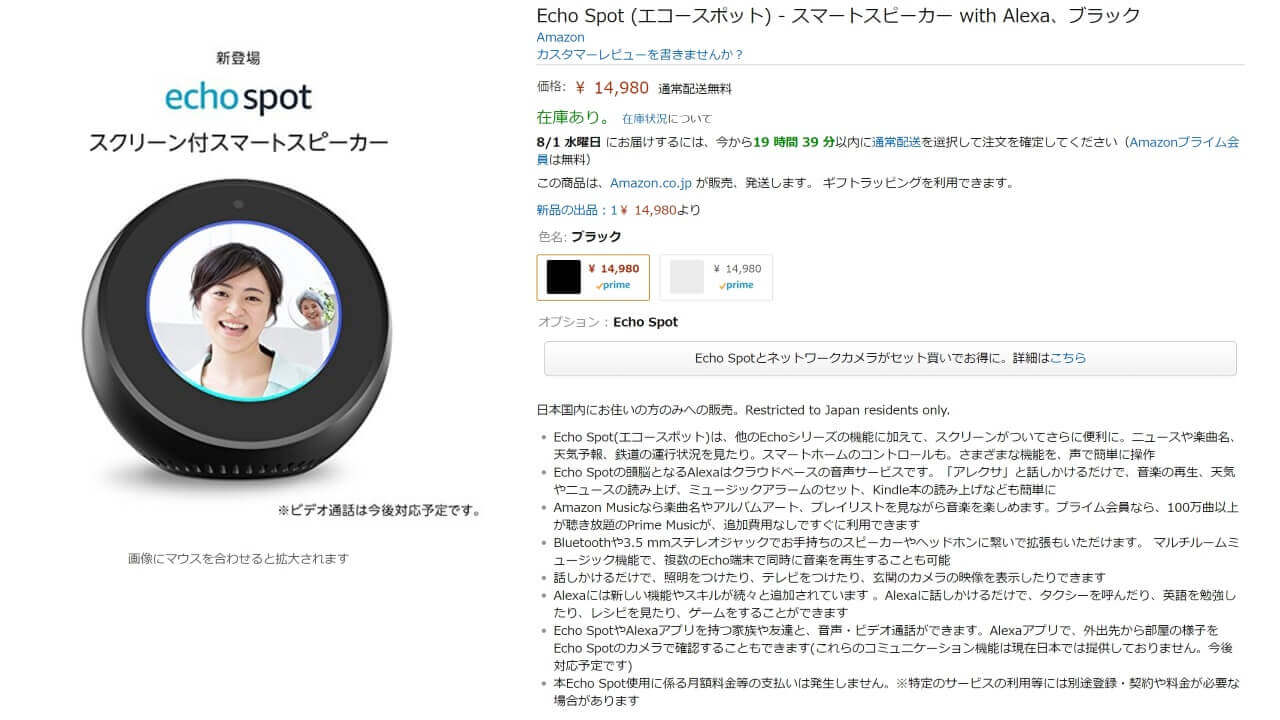 「Echo Spot」のラーバリエーションは “ブラック” と “ホワイト” の 2 色で、価格は14,980 円です。また、当初 6 月 24 日までに 2 個同時購入すると 1 個が半額の7,490 円になる半額キャンペーンが開催されていたのですが、このキャンペーンは 8 月 12 日まで延長中です。
