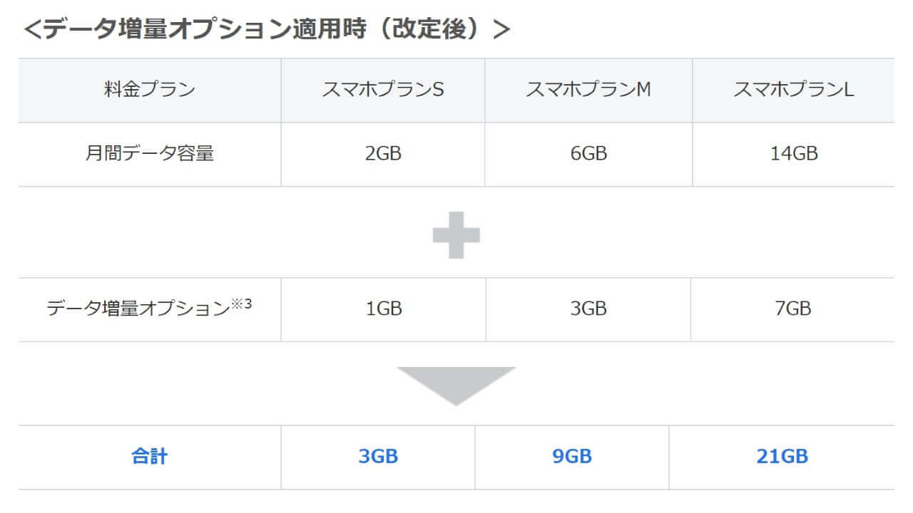 しかし、「データ増量無料キャンペーン」がなくなるわけではありません。「データ増量無料キャンペーン」が適用された場合、元のデータ容量分が 2 倍となったデータ容量に上乗せされ、旧プランのデータ容量からみて 2.5 倍の増量となります。