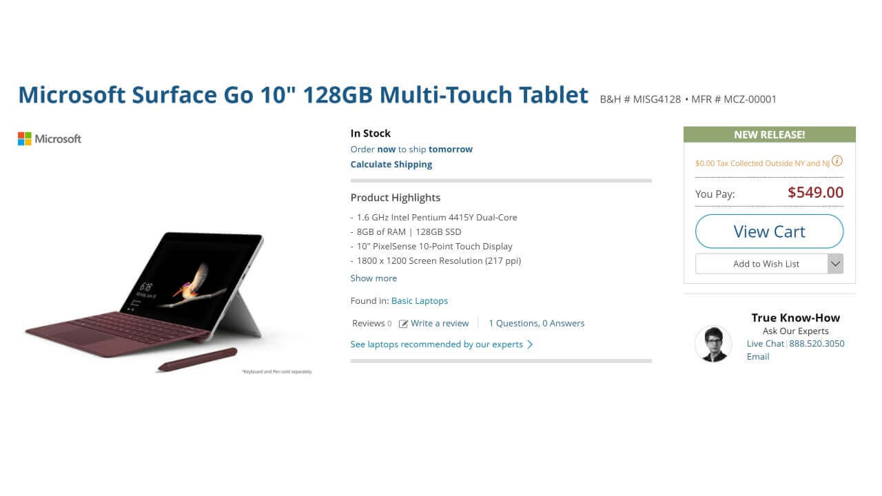 米国のビデオ & カメラ量販店 B&H に、Microsoft の Windows 10 搭載 2 in 1 タブレット「Surface Go」8GB RAM + 126GB 内部ストレージモデルが、ついに入荷した模様です。