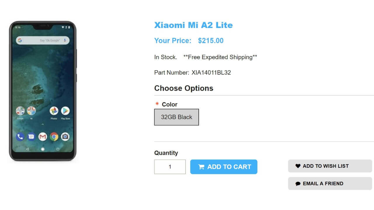 1ShopMobile における「Xiaomi Mi A2 Lite」の本体価格は、国際送料込 $215.00(約 24,000 円)です。ちなみに、32GB 内部ストレージの “Black” のみがラインアップされています。