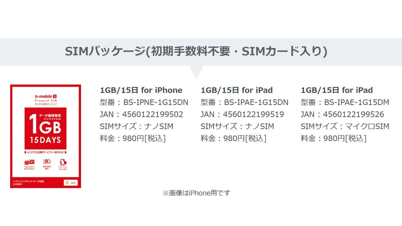 ちなみに iPhone 用の「1GB 15DAYS for iPhone」、nano SIM 版 iPad と micro SIM 版 iPad 用の「1GB 15DAYS for iPad」2 種類の、合わせて 3 パッケージがあります。