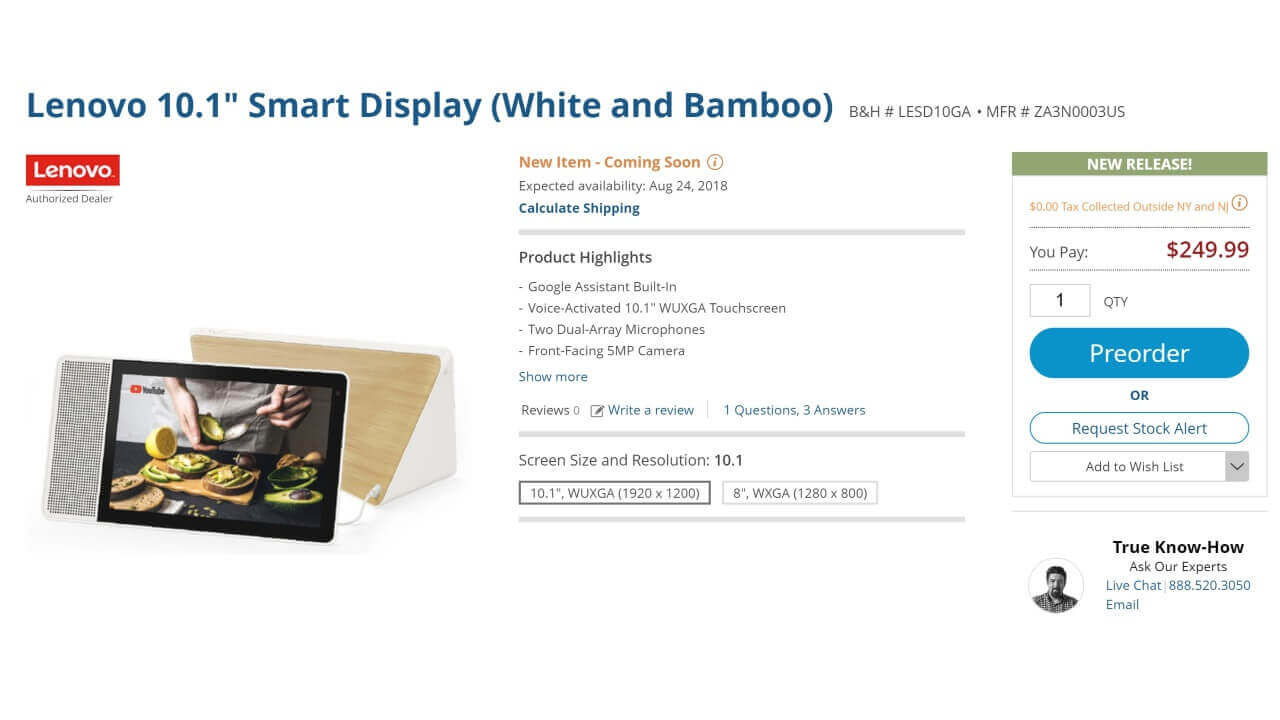 B&H では以前より 2018 年 9 月 3 日入荷予定として予約が行われていたのですが、今回更新された日程では 8 月 24 日と、10 日ほど前倒しされました。ちなみに B&H は、「Lenovo Smart Display 8 / 10.1」の海外発送を行っています。つまり、日本から直輸入可能です。