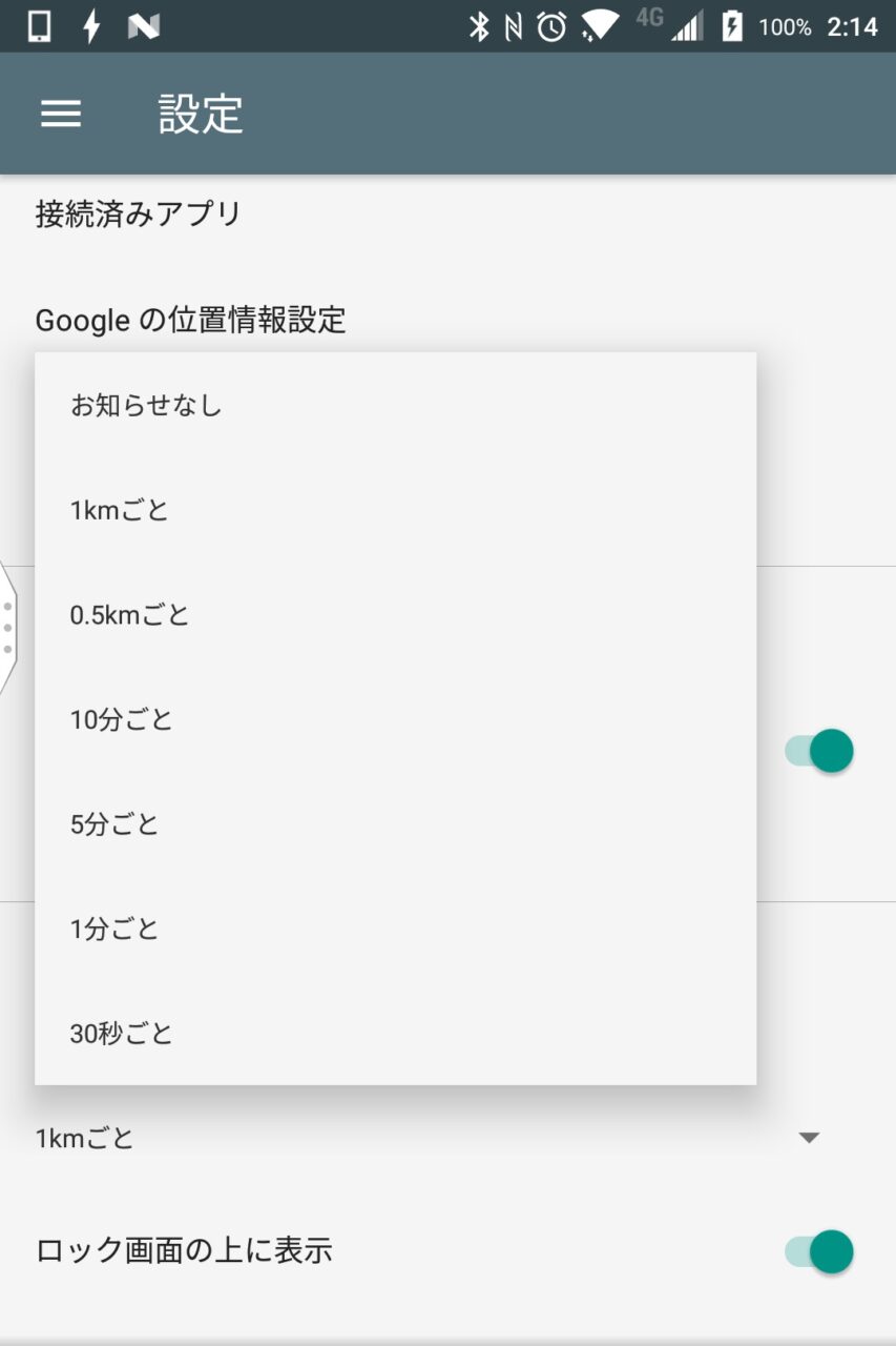 “音声通知” が設定項目です。デフォルトでは “1km” になっていて、このほかに “0.5km” “10 分” “5 分” “1 分” “30 秒” の中から音声通知の間隔を選択することができます。