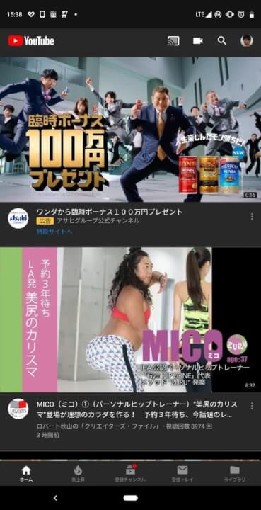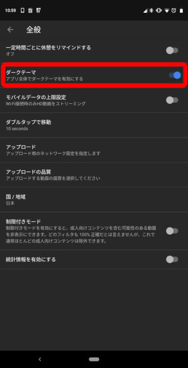 実際の“ダークテーマ” に切り替える方法は、「YouTube」アプリの “設定” → “全般” へと進み、ページ上から 2 番目の “ダークテーマ” スイッチを ON にするのみ。これで、“ダークテーマ” を利用できるようになります。