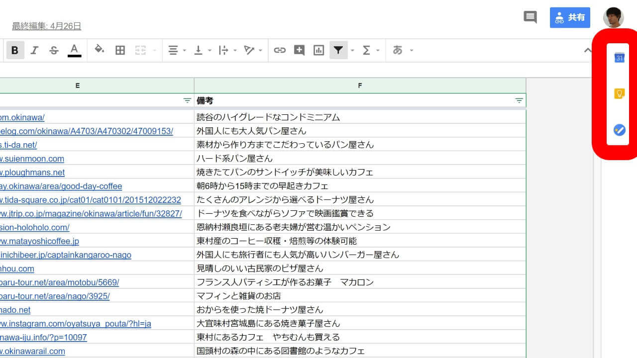 ちなみに WEB 版新「Gmail」で採用された「Google Keep」「ToDo リスト」、そして「Google カレンダー」のショートカットアイコン + 同タブ内表示 UI は、今回の「Google カレンダー」に合わせて「Google スプレッドシート」や「Google ドキュメント」でも利用できるようになっています。WEB 版新「Gmail」の UI が、拡大されているわけですね。
