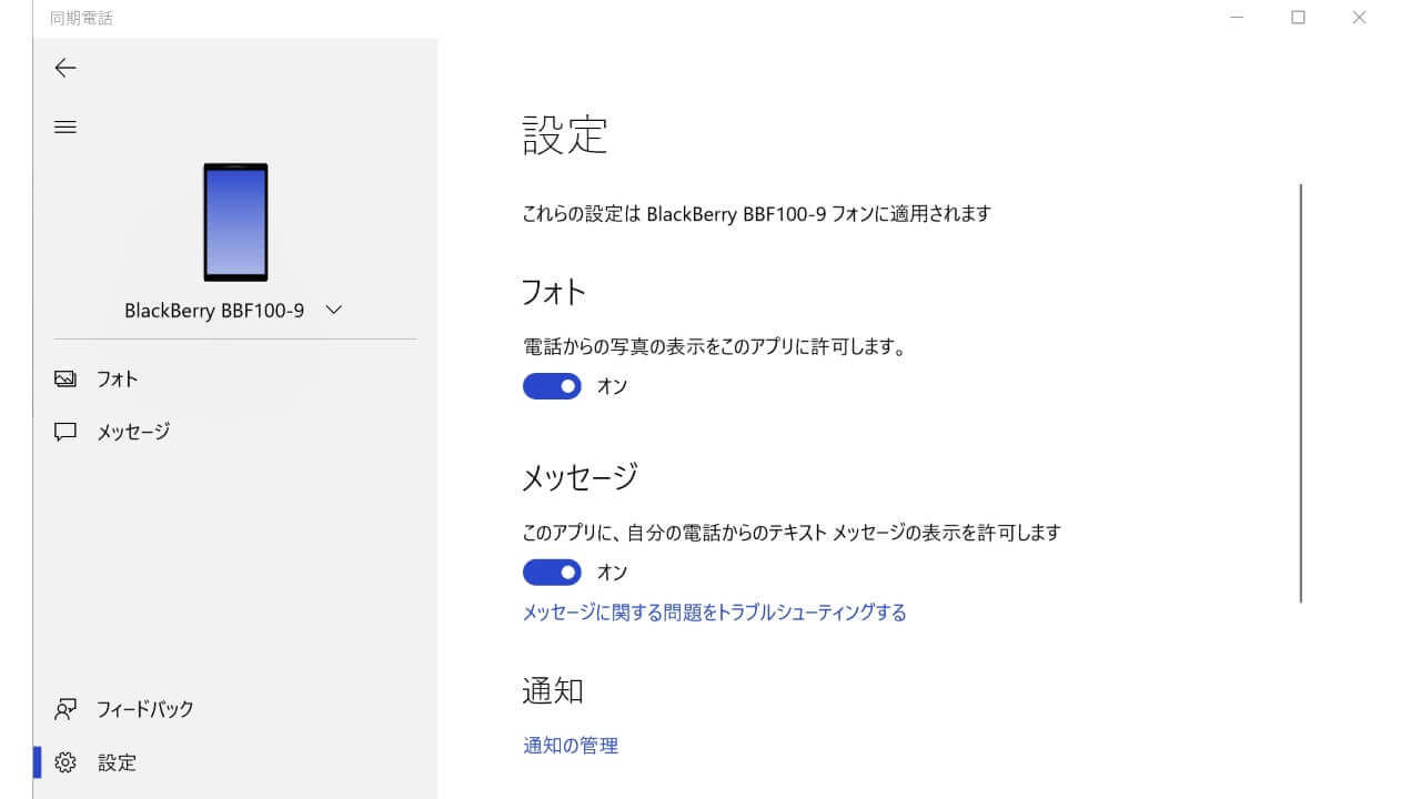 「Your Phone」にて SMS 送受信ができるようになると、「Your Phone」の左メニューバーに “メッセージ” の項目が表示されるようになります。また「Your Phone」の設定に、“メッセージ” の ON / OFF スイッチも表示されます。