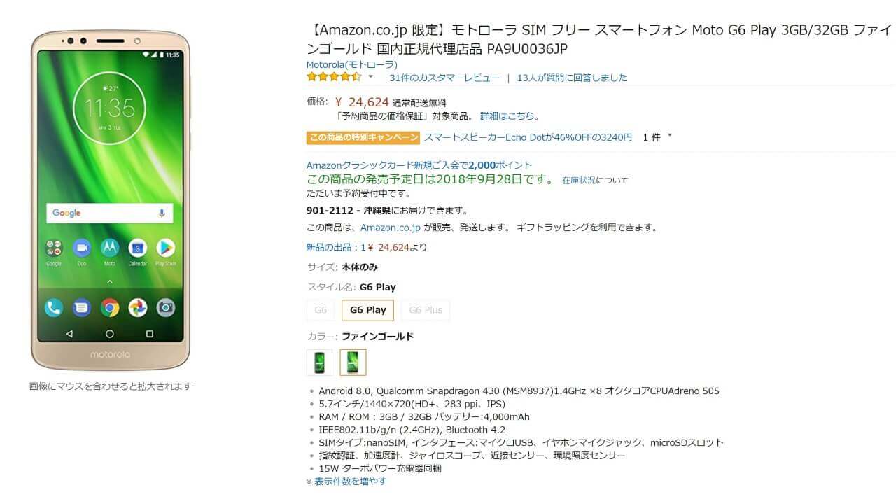 また同日より予約が開始されていますが、国内における「Moto G6 Play」は Amazon 限定販売となります。価格は 24,624 円で、カラーバリエーションは “ディープインディゴ” と “ファインゴールド” の 2 色です。