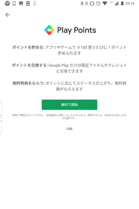 Android の Google Play にて、日本の Google アカウントでログインしている状態であればすぐに始めることができます。始める手順は簡単で、Google Play のメニューの中にある “Play Points” をタッチして、次のページで “無料で開始” をタッチするだけ。