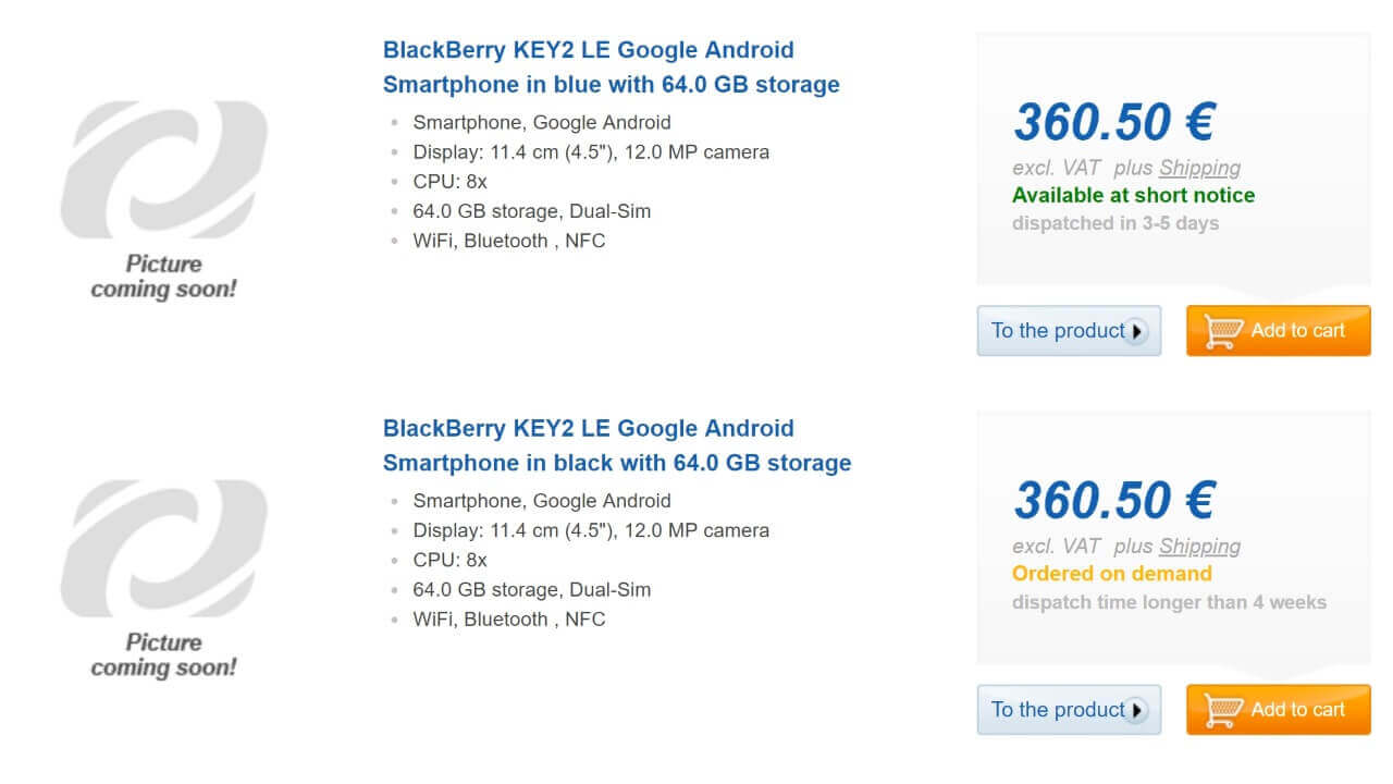 ちなみに型番についての表記がないので何のモデルかは不明ですが、恐らくはデュアル SIM モデルの型番「BBE100-4」と予想されます。Computeruniverse.net における「KEY2 LE」の本体価格は、VAT 抜き €360.50(約 47,800 円)です。