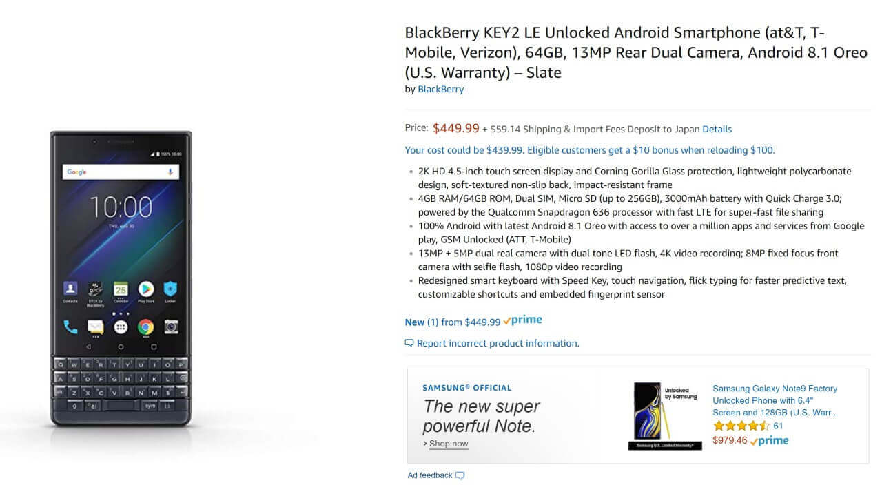 米 Amazon における「KEY2 LE」の本体価格は $449.99 で、日本直送にも対応している模様です。
