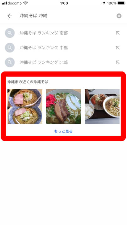 ただし必ずしも “食べ物名 + 地域” を入力したからといって食べ物写真と “もっと見る” が表示されるわけではなく、あくまでも関連するコンテンツが多い検索キーワードの場合のみ表示されます。逆に言えば、情報が多すぎるキーワードの場合は食べ物写真を見て、インスピレーションでお店を探すことができる、ということです。