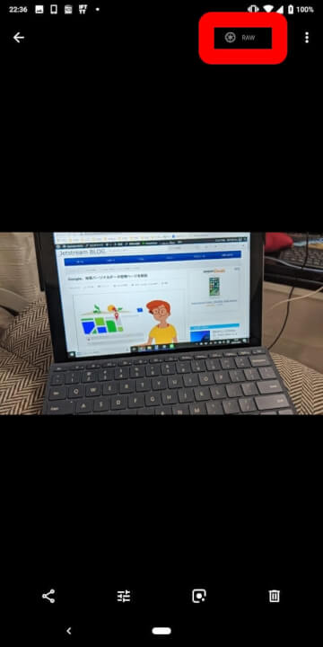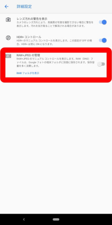 ちなみに「Google フォト」に保存された “RAW” 写真は、同じアカウントでログインしている他のスマートフォンやタブレットにももちろん共有されます。“RAW 撮影” を ON にするには、カメラの撮影タブを “その他” に切り替えて、“設定” → “詳細設定” へと進み、“RAW + JPG の管理” そスイッチを ON にするだけです。