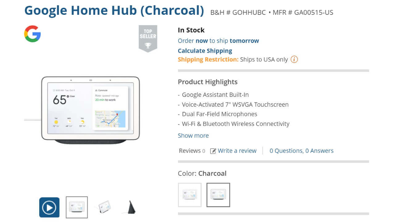 - Google Home Hub (Charcoal) B&H # GOHHUBC MFR # GA00515-US