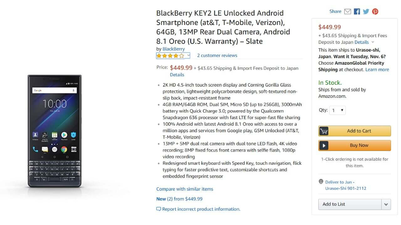 IFA 2018 で正式発表された BlackBerry 製 QWERTY キーボード搭載新型スマートフォン「BlackBerry KEY2」の廉価モデル「BlackBerry KEY2 LE」が、米国の Amazon.com にようやく入荷した模様です。