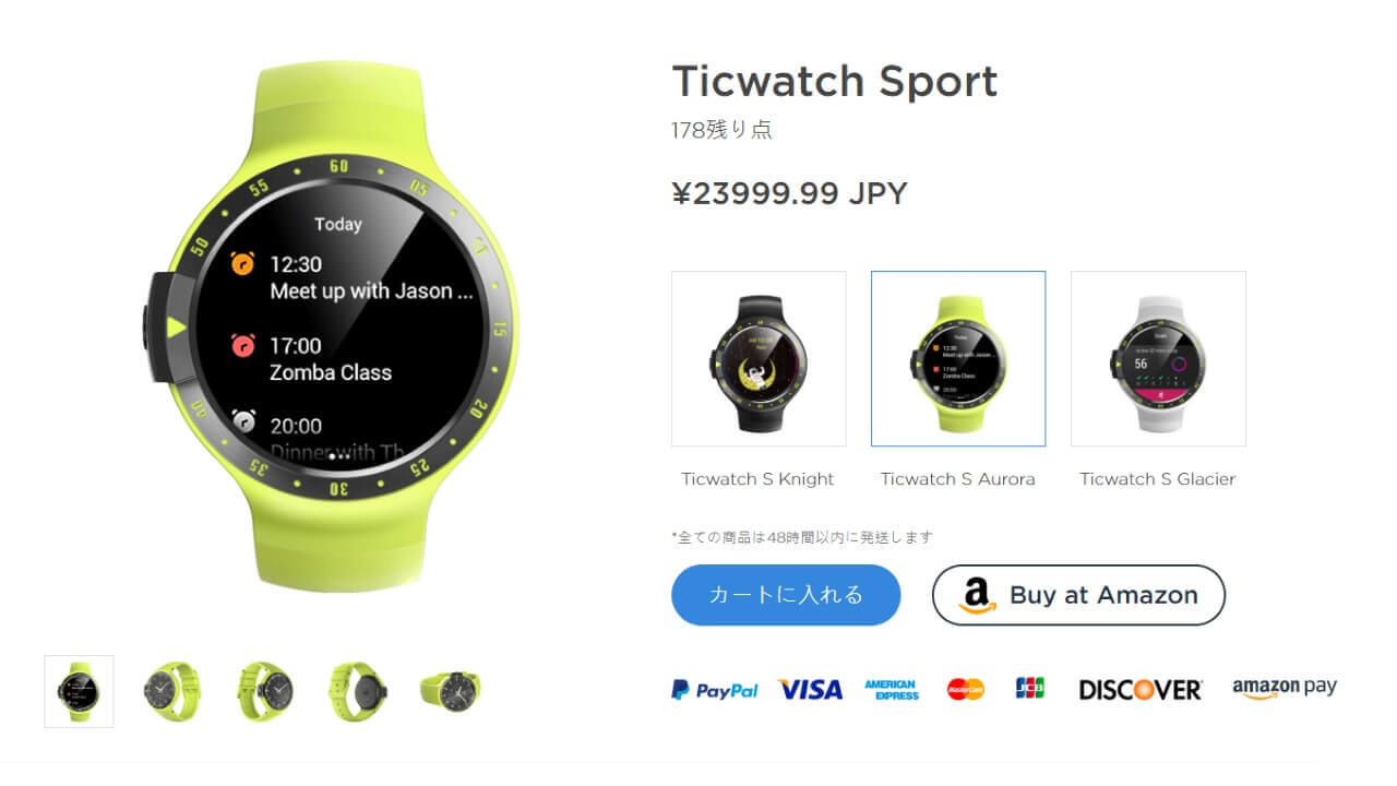 「Ticwatch S」“Aurora” と「Ticwatch E」“Lemon” はまだ Amazon.co.jp では販売されていないので、このカラーを狙っている方はチャンスかもしれないですね。