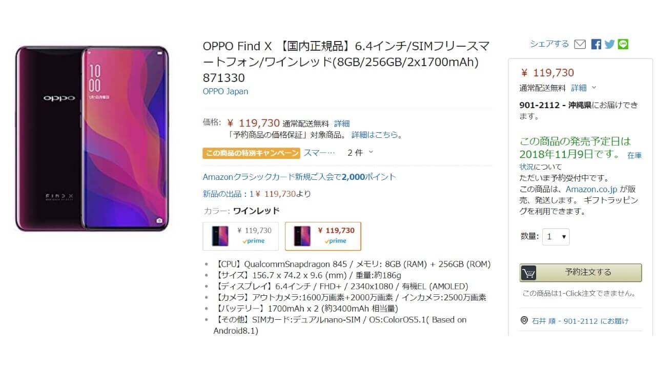 「OPPO Find X」のカラーバリエーションは、“サイレントブルー” と “ワインレッド” の 2 色展開です。Amazon 価格は、119,730 円。