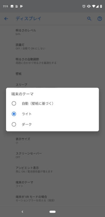 ちなみに「Pixel 3」などで用意されているディスプレイ設定内の “端末のテーマ” を “ライト” に切り替えても、「電話」アプリは “ダークモード” のままでした。今後、「電話」アプリがテーマを切り替えられるようになるのかは不明です。