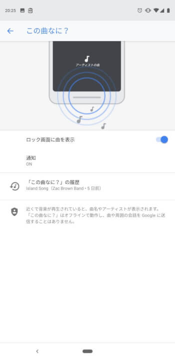 この「サウンドサーチ」は楽曲が流れている状態で「サウンドサーチ」を起動する必要があるのですが、Pixel スマートフォンではいちいち「サウンドサーチ」を起動することなく、いつでも「サウンドサーチ」の待ち受け状態にして、近くで流れている楽曲をロック画面に自動表示してくれる機能「この曲なに?」があるんです。
