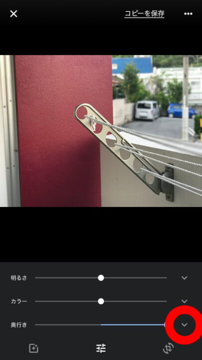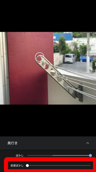また焦点を当てる部分をタッチすることで、そこを中心に背景をぼかしたり、焦点を定めた状態で矢印アイコンをタッチして “前景ぼかし” のスライドバーを動かすことで、焦点を定めた部分をぼかして背景をはっきりと映るように調整することも可能。