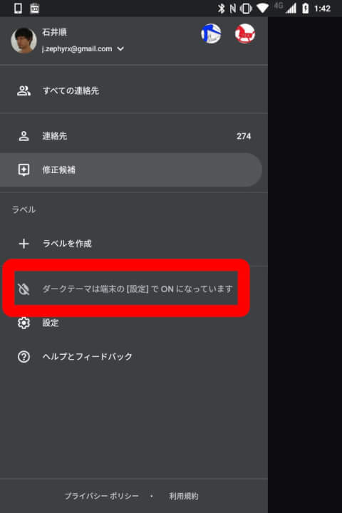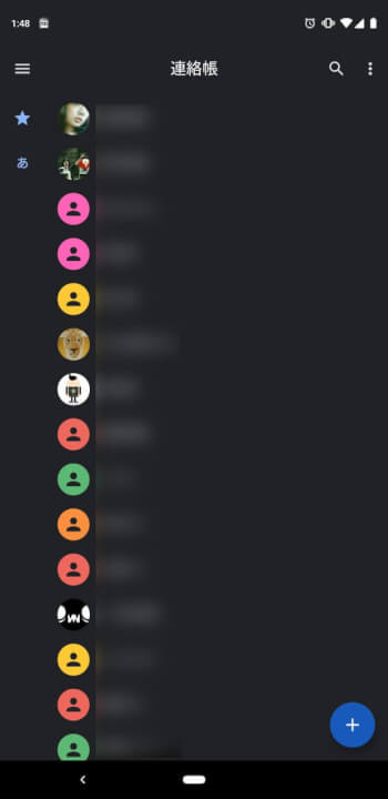 「連絡帳」のダークテーマはほかのアプリのダークテーマと少し異なり、アプリの設定で ON / OFF はできなくないのですが、例えば「Pixel 3」「Pixel 3 XL」などの Android 9 Pie 搭載機種で本体の設定からシステムのテーマをダークテーマにしている場合、「連絡帳」も強制的にダークテーマとなります。またバッテリーセーバモードが ON の場合も、強制的にダークテーマが ON になります。なんとなく複雑です。