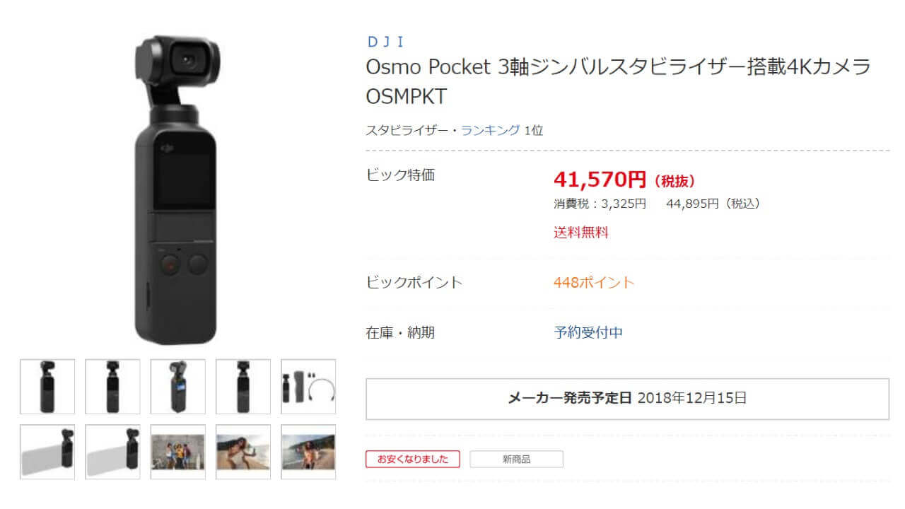 つまり、DJI や Amazon と同等価格に値下げしたわけです。ポイント還元率は 10% から 1% に下がっていますが、DJI 定価の送料消費税込み 44,900 円よりは実質的に 500 円程度安価となります。少しでも安く「Osmo Pocket」を購入したい方は、ビックカメラがオススメです。