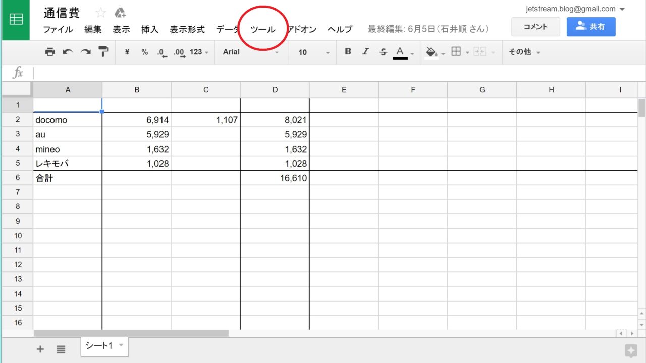 「Google スプレッドシート」に変更が加えられたときにメールで通知するようにする設定方法は、「Google スプレッドシート」を開き、上部のメニューバーにある “ツール” をクリックし、表示される項目から “通知ルール” をクリックします。