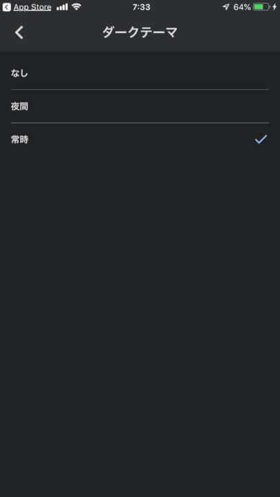 また「Google ニュース」アプリの “ダークテーマ” は単なる ON / OFF だけでなく、夜間に自動で適用される “夜間” も選択可能。Android 版では選択できる、省電力状態のときに適用される “バッテリーセーバーモード時のみ” はありません。“ダークテーマ” 自体、夜間などでも明るすぎない表示で目の負担を軽減するだけでなく、通常よりもディスプレイ消費電力を下げバッテリー消費を抑える効果があるので、「Google ニュース」をよく回覧するユーザーは “常時” を選んでおいたほうがいいかもしれません。