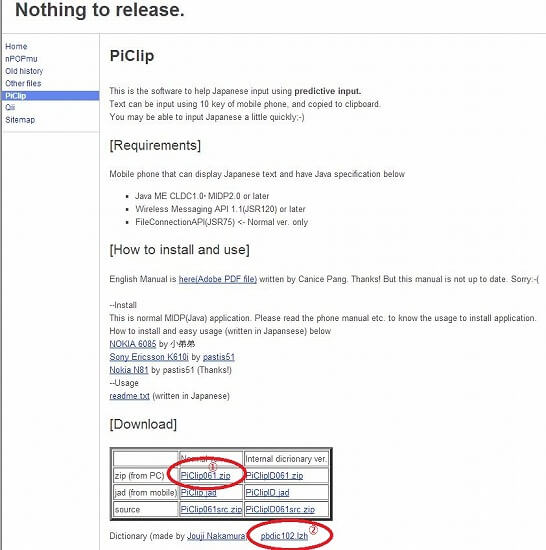 1:こちらのサイトの[Download]から①PiClip061.zipと②pbdic102.lzhをPCにダウンロードし任意の場所に解凍する。