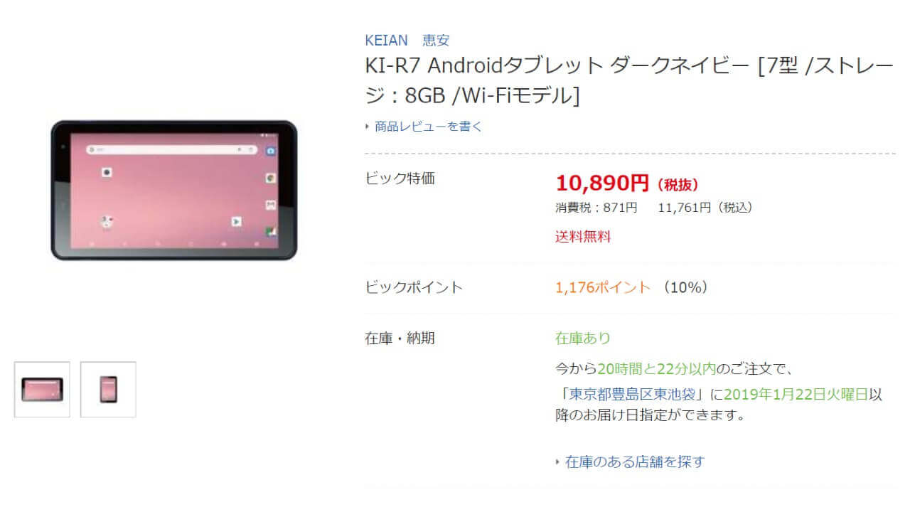 2019 年 1 月 10 日に発表されすぐにノジマ電気で発売された、恵安製で国内初の Go Edition(Android 8.1 ベース)搭載タブレット「KEIAN KI-R7」が、ビックカメラでも販売開始されました。