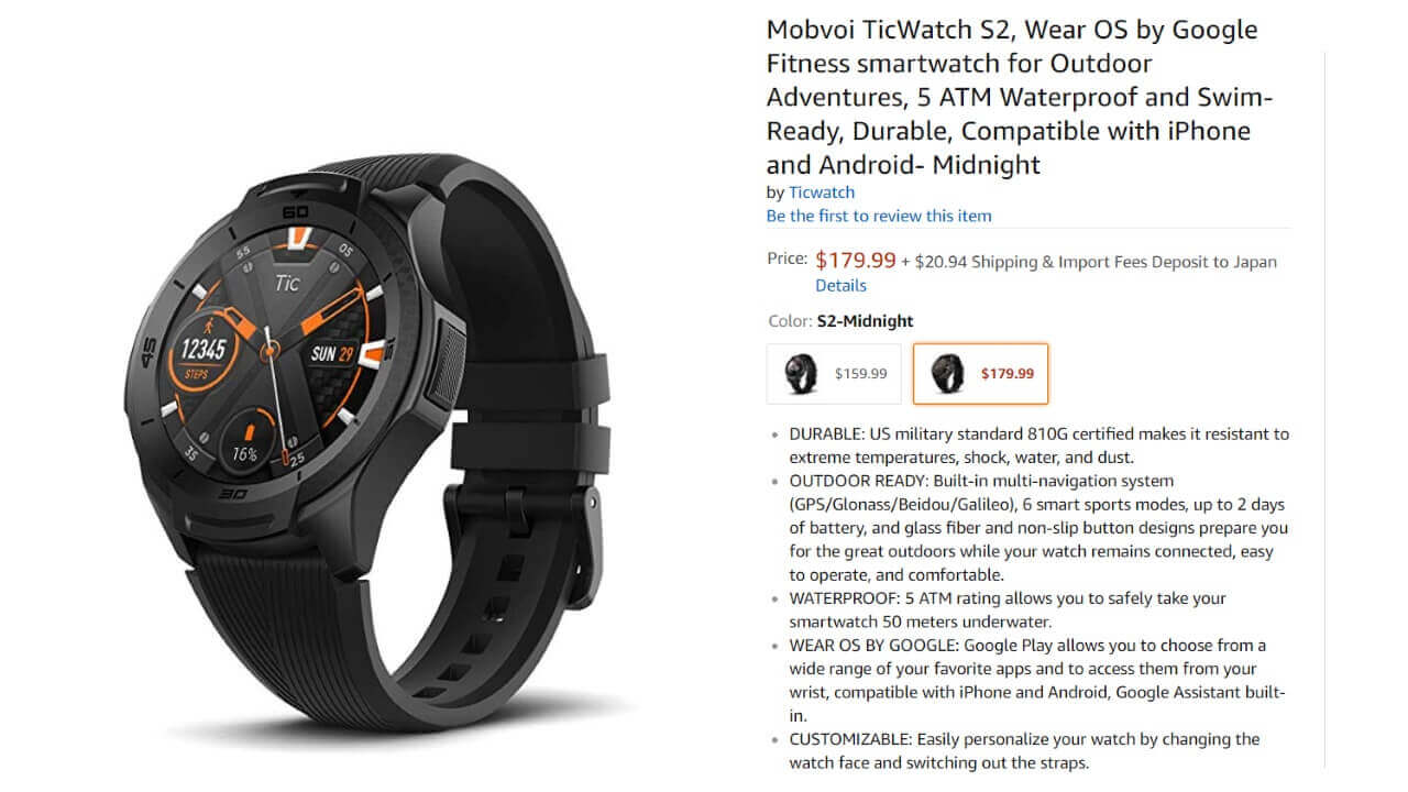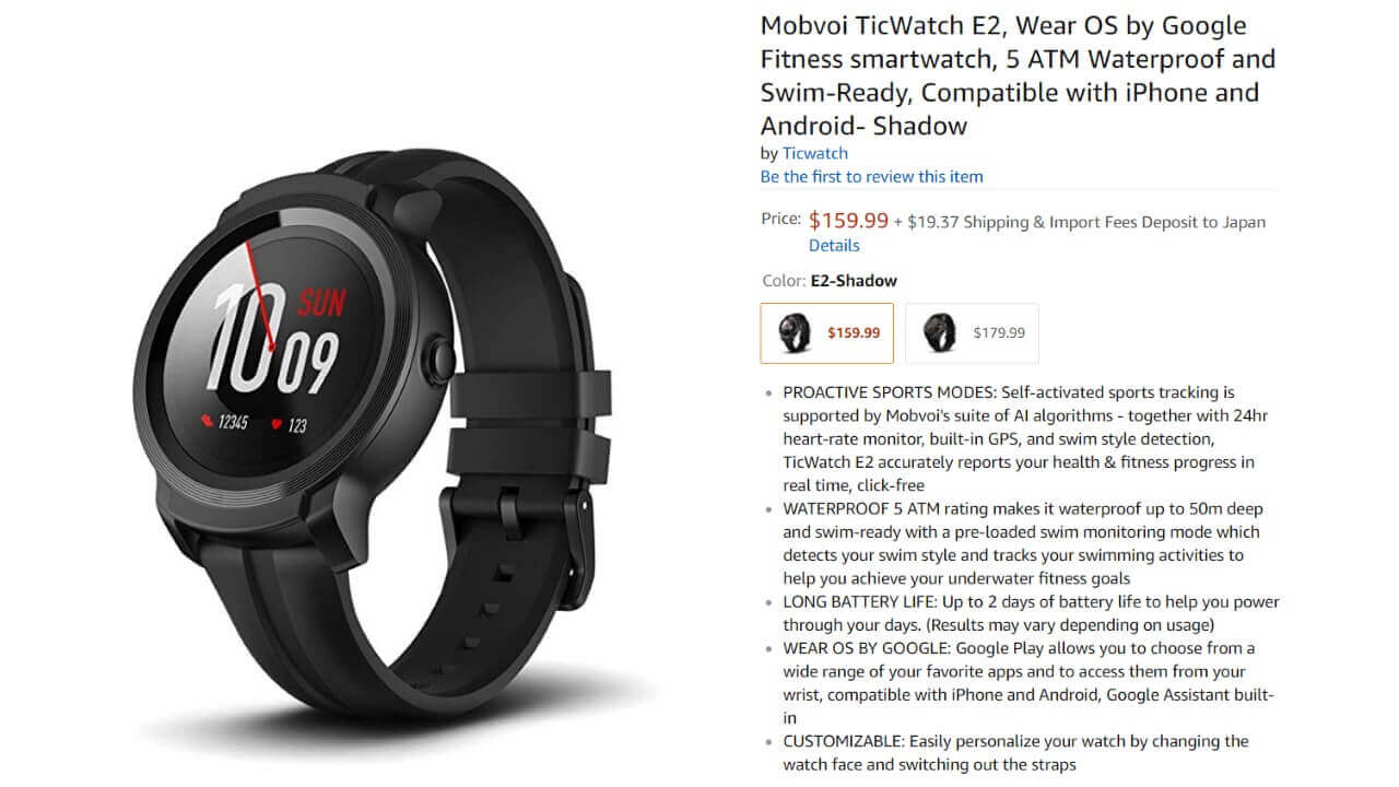 今のところ海外での発売となりますが、Mobvoi 公式サイトのほかに米国の Amazon.com にもラインアップされていて、なんとそれぞれの機種を直輸入することも可能です。そして気になる価格は、「TicWatch S2」が $179.99、「TicWatch E2」が $159.99。予想通りかなり安価となりましたね。
