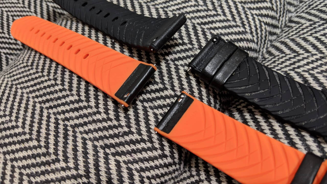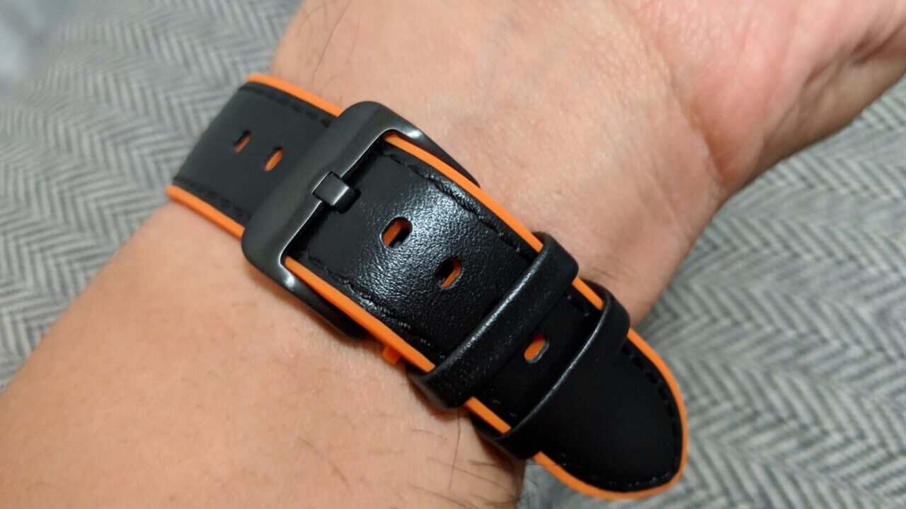 「Ticwatch Pro」純正バンドのレザー + ラバータイプと素材も同じ。裏がオレンジカラーの配色となっている点がポイントってだけです。