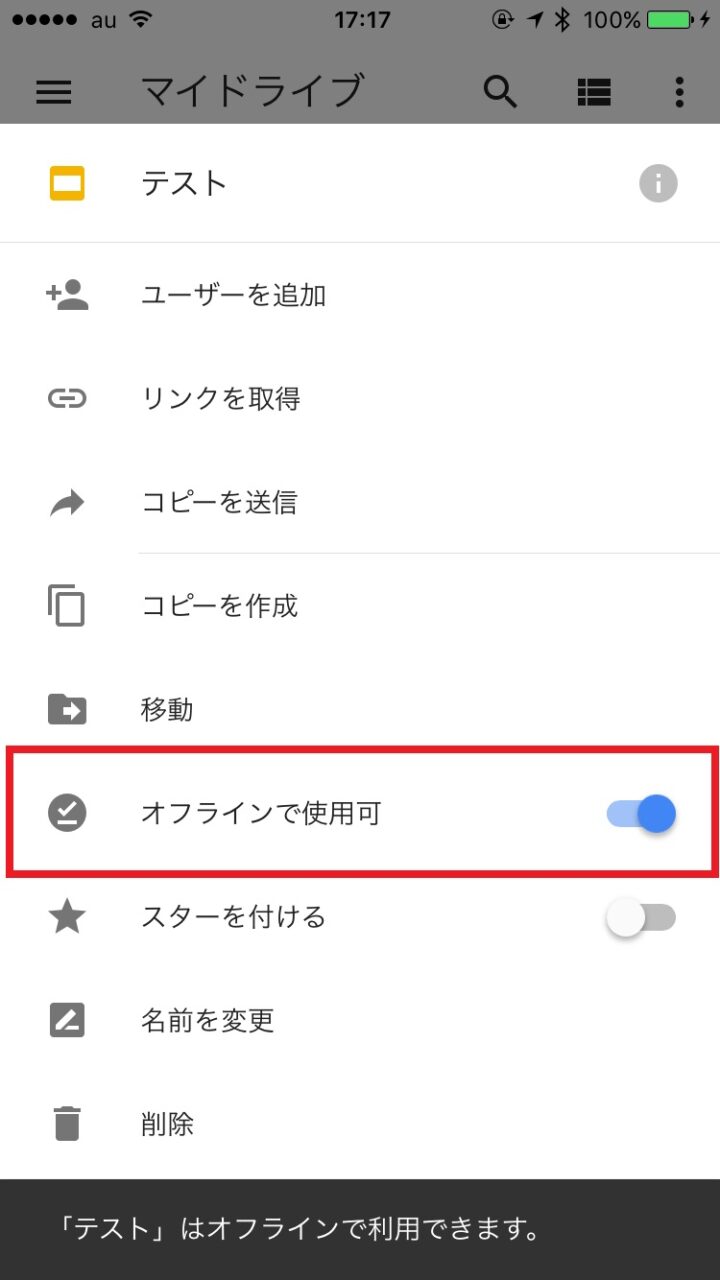 これで、電波がなかったり弱い場所でも「Google ドライブ」のファイルを回覧したり編集することができるようになります。