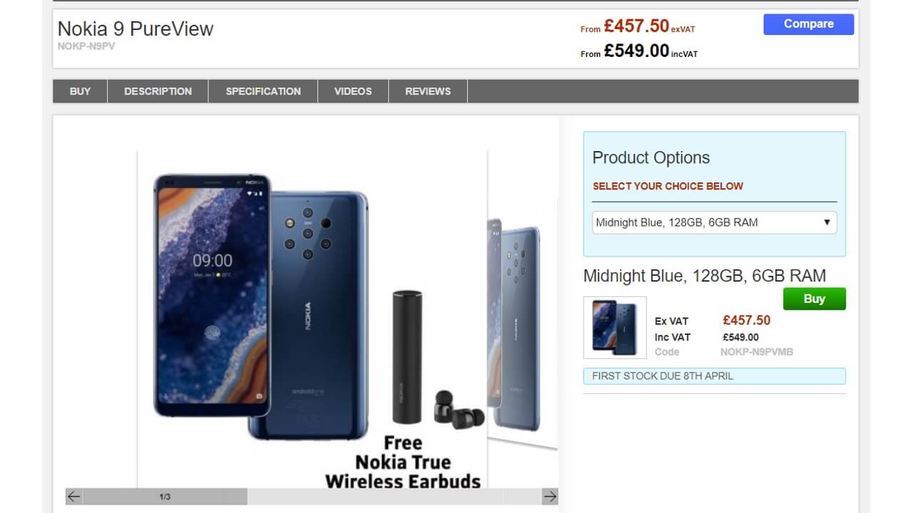 Clove における「Nokia 9 PureView」の予約価格は VAT 抜き £457.50(約 66,550 円)で、今のところ 2019 年 4 月 8 日入荷予定としています。