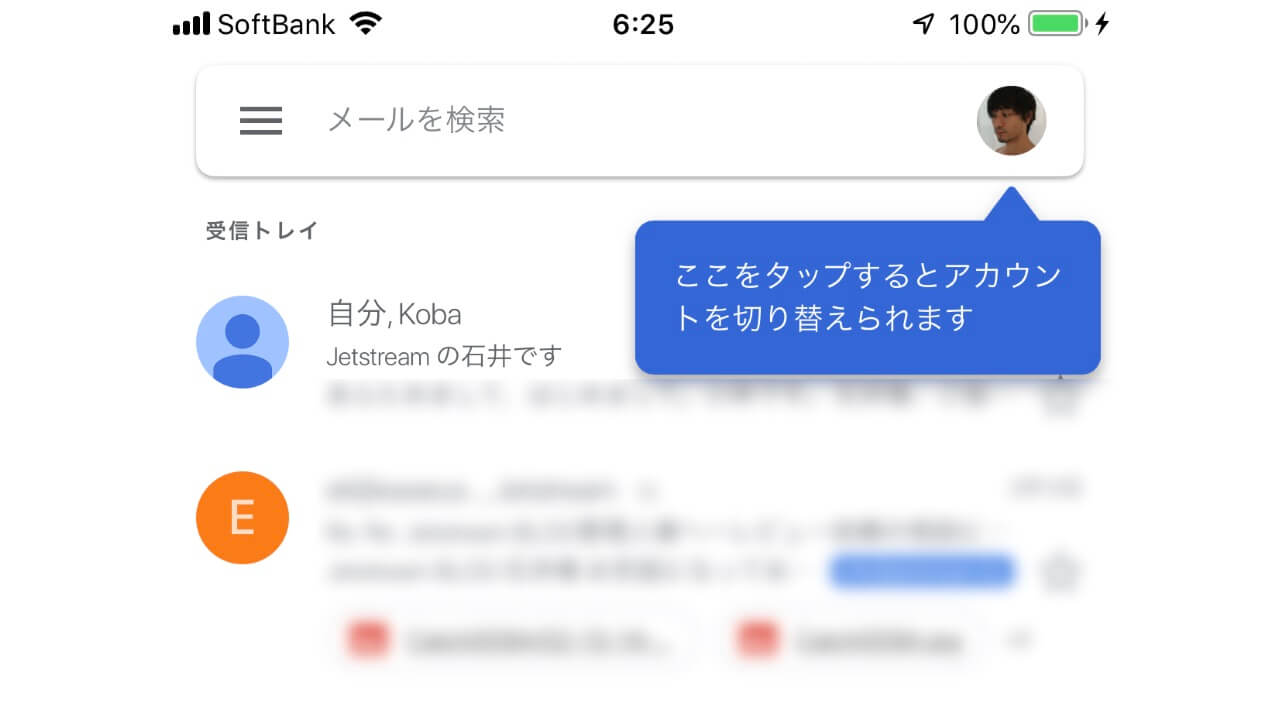 検索ボックスも画面上部に配置されているので、メール検索を素早く行うこともできます。