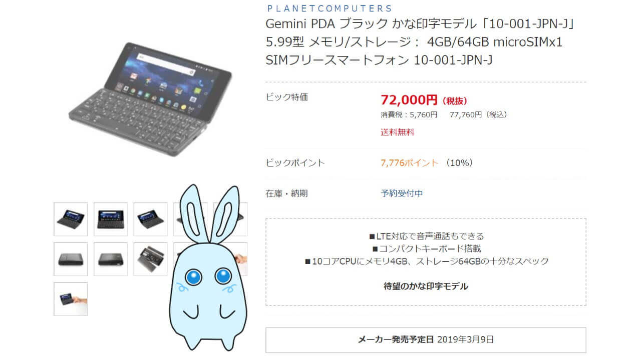 2019 年 3 月 1 日にリンクスインターナショナルから発表された、2018 年末に発売した英国メーカー Planet Computers との国内代理店契約締結に伴う第 1 弾製品のクラムシェル型 Android「Gemini PDA」の、US キーボード配列の日本語かな印字モデルが、ビックカメラに登場しました。