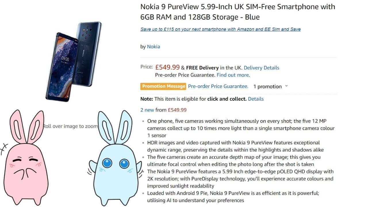 世界初 5 リアカメラ搭載ハイスペックスマートフォンとして MWC 2019 で Nokia から発表された「Nokia 9 PureView」ですが、英国の Clove などで予約が行われていてあと数日で出荷が開始されますが、同じく英国の Amazon.co.uk でも予約受付中です。