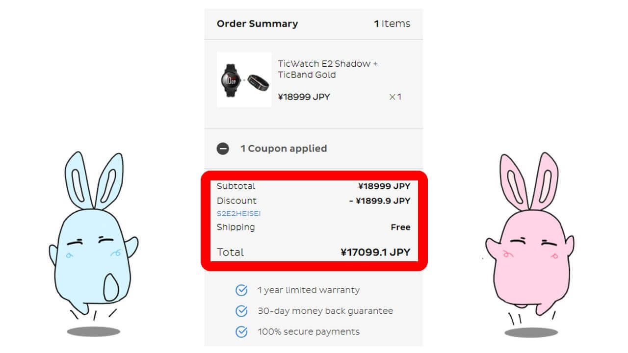 10% 引きの条件は、当ブログで公開するクーポンコード『S2E2HEISEI』を、Mobvoi 公式オンラインショップで入力するのみ。とっても簡単に「TicWatch S2」が 2,200 円引き、「TicWatch E2」が 1,900 円引きとなります。