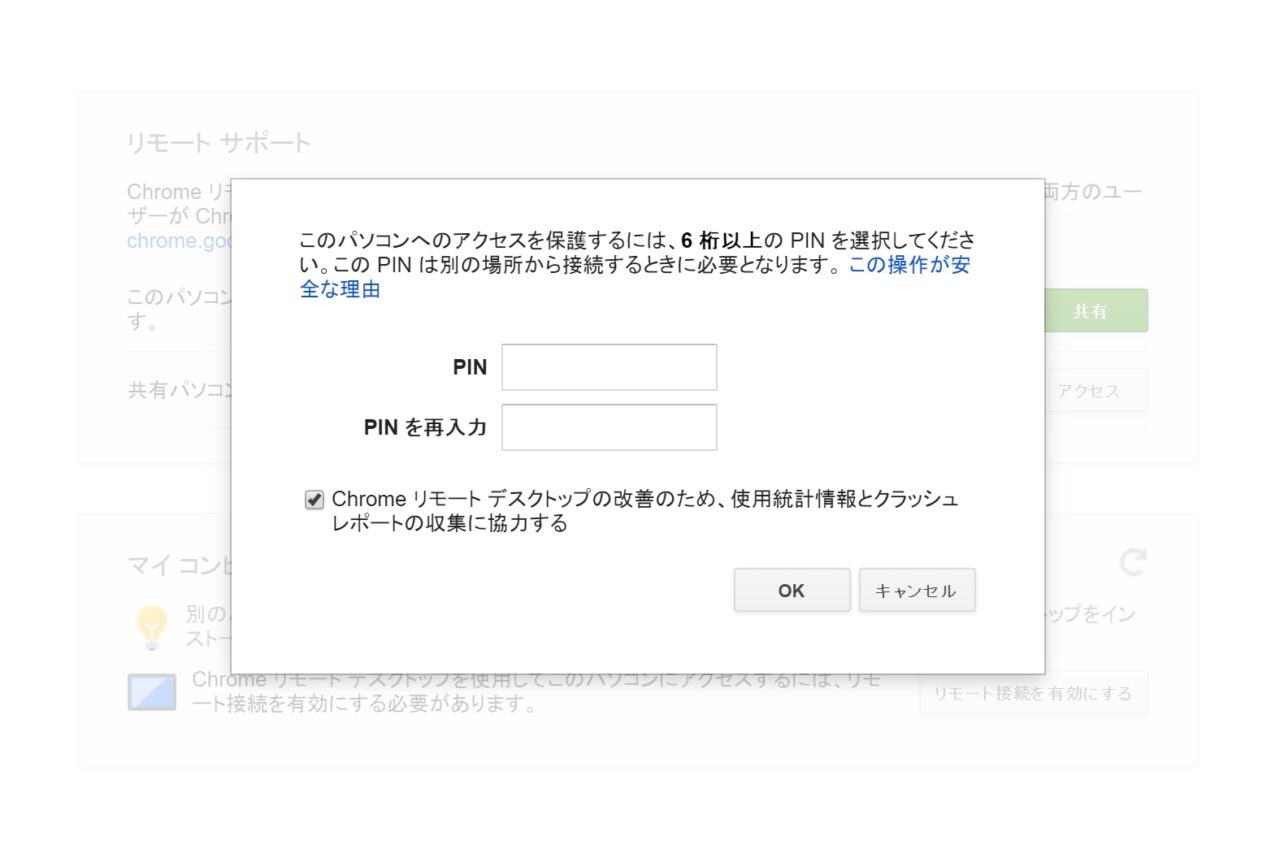 “Chrome リモート デスクトップ ホスト インストーラ” をインストールすると、スマートフォンでアクセスする際の暗証番号となる “PIN 番号” の設定を求められるので、6 桁の “PIN 番号” を設定します。