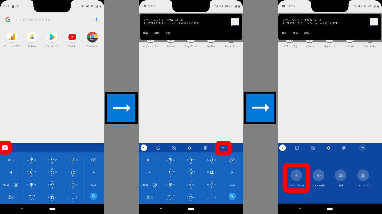 「Gboard」の “クリップボード” 利用手順は、まず機能自体を ON にしておいた状態で、矢印 → “・・・(メニュー)” アイコン → “クリップボード” をタッチします。するとこれまでコピーしたテキストの履歴が表示されるので、その中から任意のテキストをタッチします。これですぐにテキストの貼り付けが行われます。