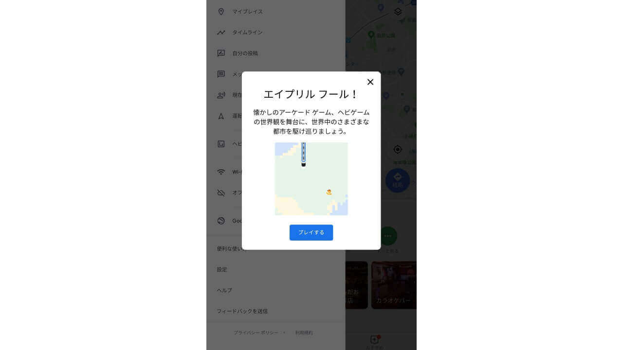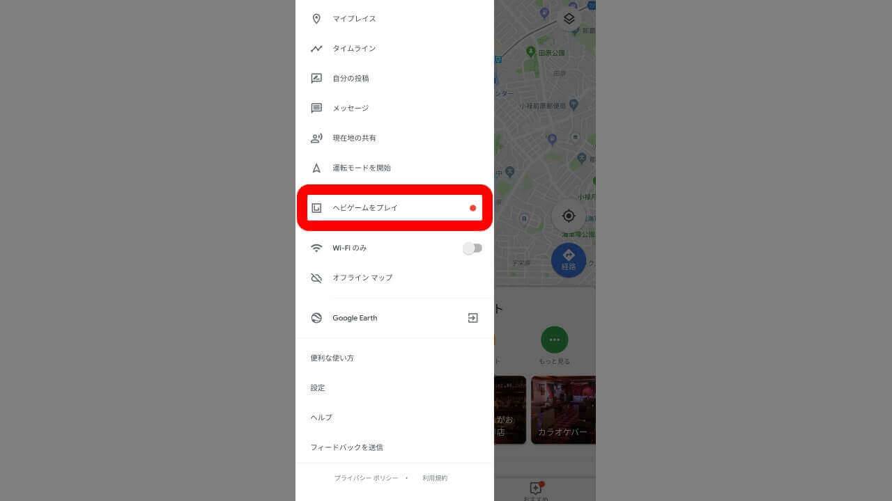 “ヘビゲーム” は Android と iOS 用「Google マップ」で遊ぶことが可能。メニューを表示して、“ヘビゲームをプレイ” から進んでいくだいけです。