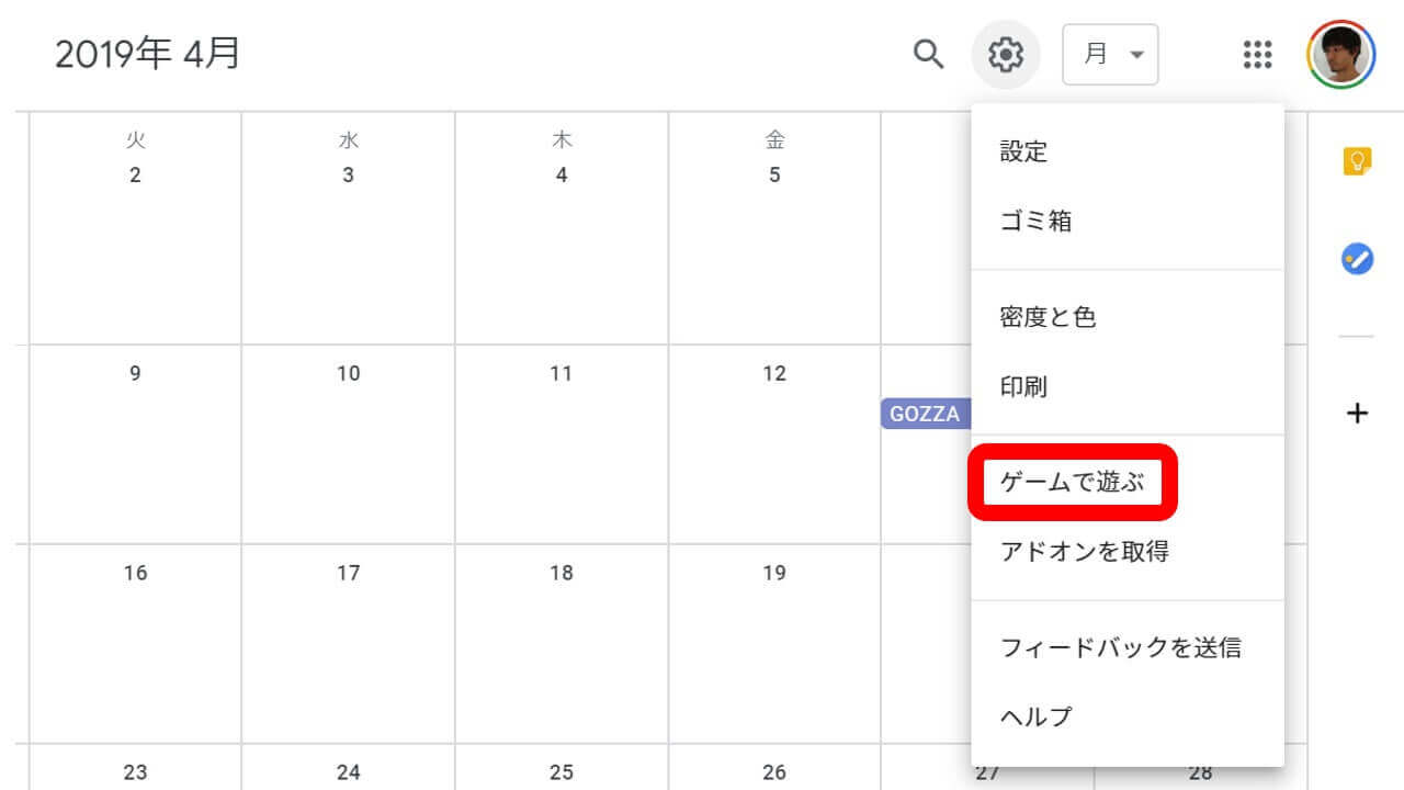 WEB 版「Google カレンダー」のゲームを遊ぶには、「Google カレンダー」の設定メニューから “ゲームで遊ぶ” をクリックして進むのみです。