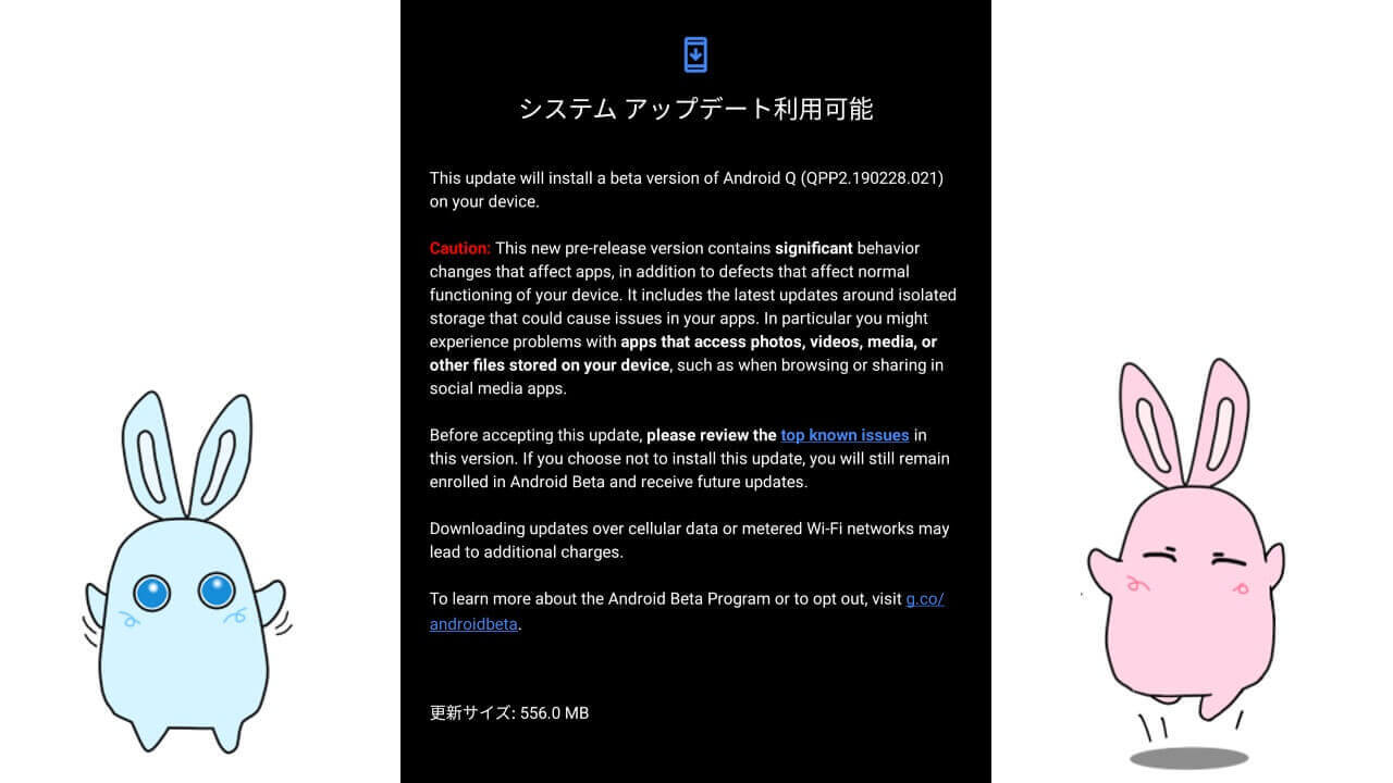 「Android Q Beta 2」は「Pixel 用 Android ベータプログラム」を適用している Pixel スマートフォンに対して、「Over the Air(OTA)」で配信が開始されています。アップデートのファイルサイズは 556MB と、結構大きめです。