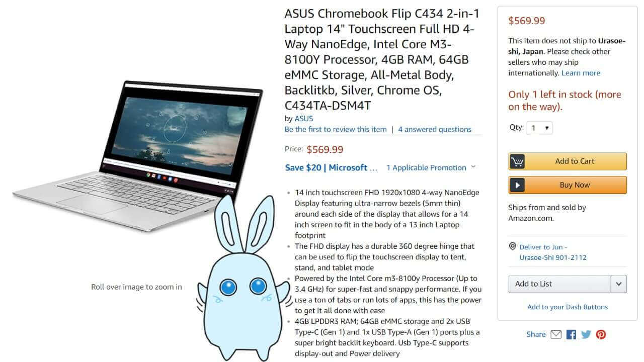 2019 年 4 月 5 日に発売されたものの最初から在庫切れとなっていた、米国 Amazon.com における ASUS 製新型 Chromebook「Chromebook Flip C434」が、早くも再入荷した模様です。