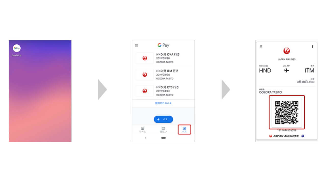 - 「Google Pay」から搭乗券を表示する手順
